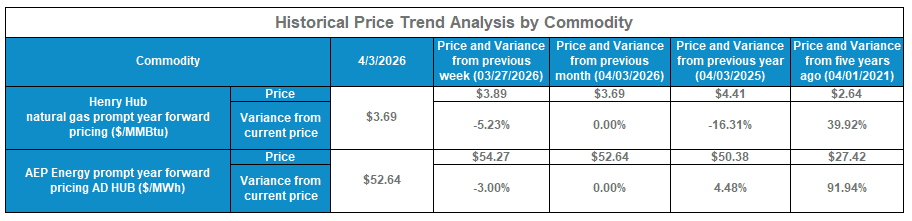 AEP Energy does not guarantee the accuracy, timeliness, suitability, completeness, freedom from error, or value of any information herein. The information presented is provided “as is”, “as available”, and for informational purposes only, speaks only to events or circumstances on or before the date it is presented, and should not be construed as advice, a recommendation, or a guarantee of future results. AEP Energy disclaims any and all liabilities and warranties related hereto, including any obligation to update or correct the information herein. Summaries and website links included herein (collectively, “Links”) are not under AEP Energy’s control and are provided for reference only and not for commercial purposes. AEP Energy does not endorse or approve of the Links or related information and does not provide any warranty of any kind or nature related thereto. Forward-looking statements contained herein are based on forecasted or outlook information (including assumptions and estimations) but any such statements may be influenced by innumerable factors that could cause actual outcomes and results to be materially different from those anticipated. As such, these statements are subject to risks, uncertainties, fluctuating market conditions, and other factors that may cause actual results to differ materially from expectations and should not be relied upon. Whether or how the customer utilizes any such information is entirely its responsibility (for which it assumes the entire risk).