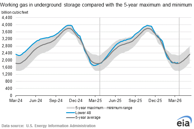 Working gas in storage was 1,865 Bcf as of Friday, March 27, 2026, according to EIA estimates. This represents a net increase of 36 Bcf from the previous week. Stocks were 96 Bcf higher than last year at this time and 54 Bcf above the five-year average of 1,811 Bcf. At 1,865 Bcf, total working gas is within the five-year historical range.