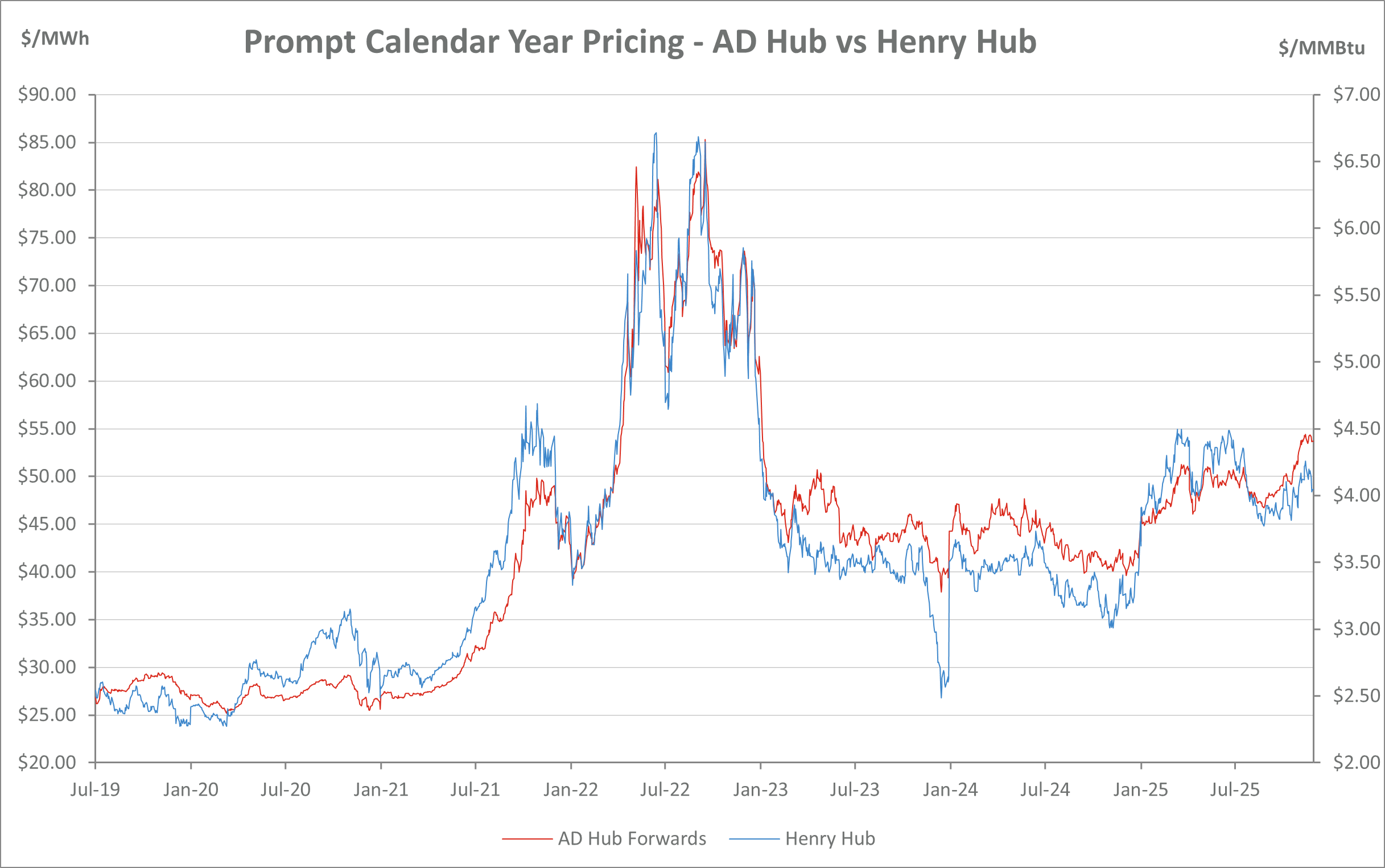 AD Hub Electricity vs. Henry Hub Natural Prices