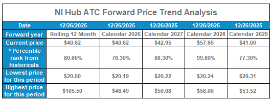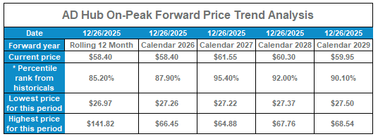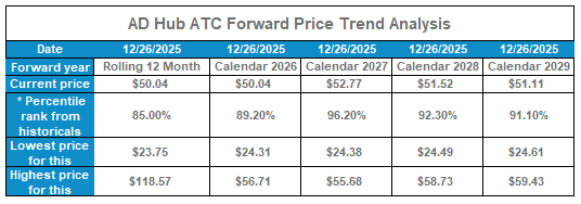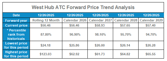 *Percentile rank from historicals represents the relation of current price and how it compares to historical pricing. For Calendar 2027, 96.2% indicates that the current price is lower than 3.8% of historical pricing dating back to July 2017.