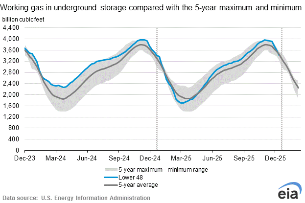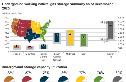 Working gas in storage was 3,413 Bcf as of Friday, December 19, 2025, according to EIA estimates. This represents a net decrease of 166 Bcf from the previous week. Stocks were 129 Bcf less than last year at this time and 24 Bcf below the five-year average of 3,437 Bcf. At 3,413 Bcf, total working gas is within the five-year historical range.
