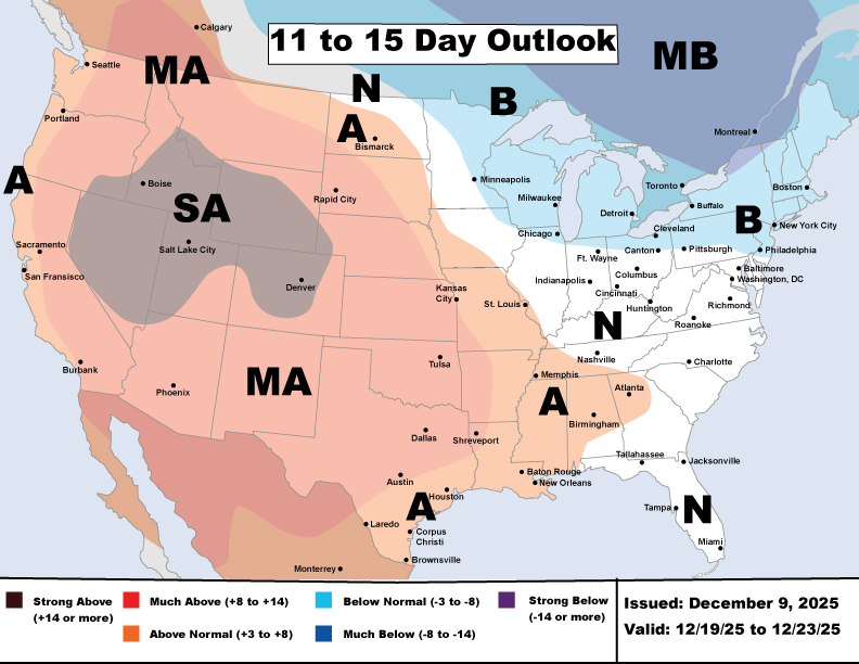 Monday December 8 – Selling pressure from late Friday continued into today. Natural gas settled below $5 as updated weather models indicated milder temperatures in the latter half of December. Prices fell sharply, down more than 35 cents, and power markets moved lower as well.