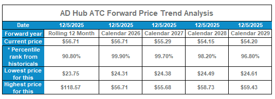 *Percentile rank from historicals represents the relation of current price and how it compares to historical pricing. For Calendar 2027, 97.1% indicates that the current price is lower than 2.9% of historical pricing dating back to July 2017.