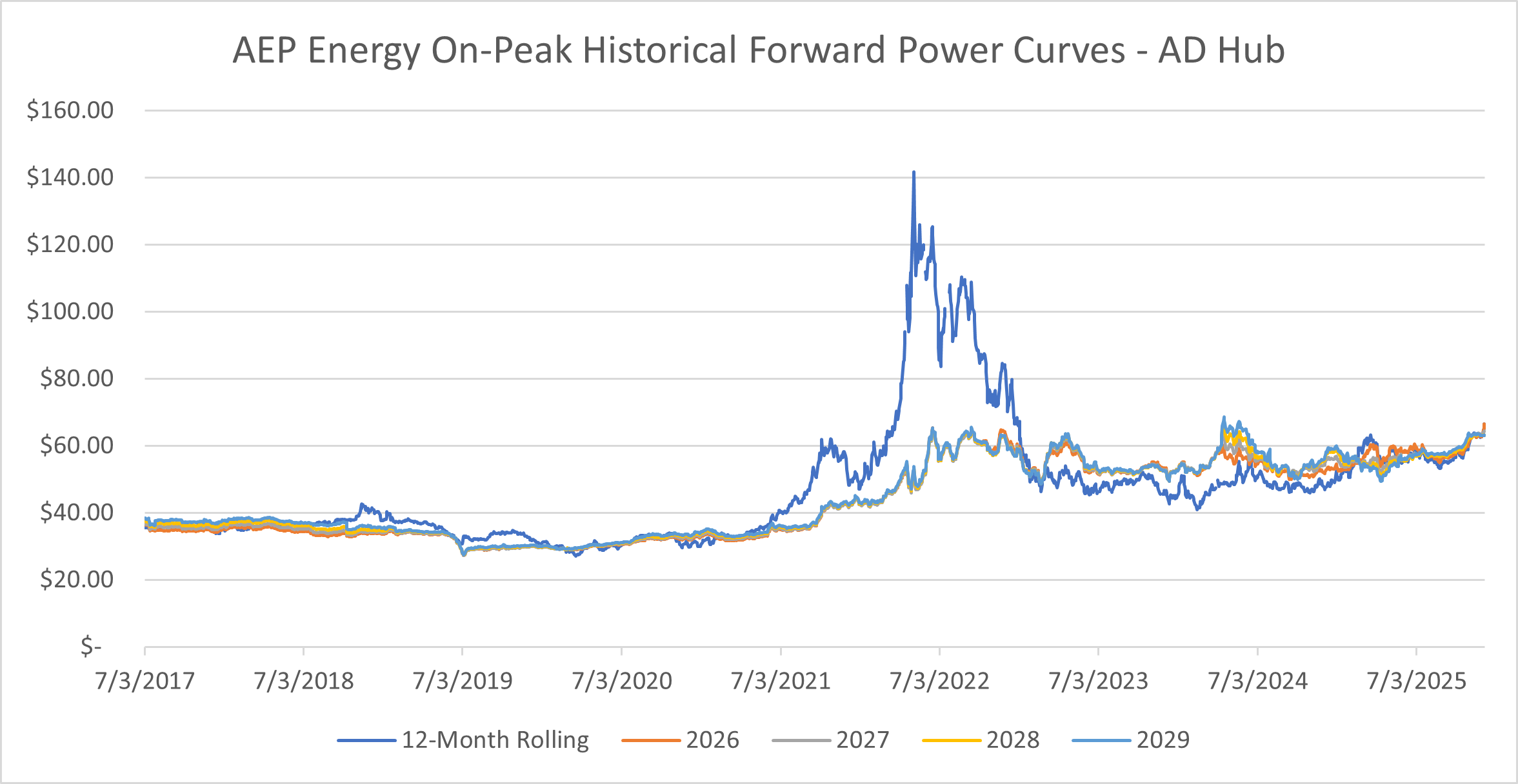 AEP Energy does not guarantee the accuracy, timeliness, suitability, completeness, freedom from error, or value of any information herein. The information presented is provided “as is”, “as available”, and for informational purposes only, speaks only to events or circumstances on or before the date it is presented, and should not be construed as advice, a recommendation, or a guarantee of future results. AEP Energy disclaims any and all liabilities and warranties related hereto, including any obligation to update or correct the information herein. Summaries and website links included herein (collectively, “Links”) are not under AEP Energy’s control and are provided for reference only and not for commercial purposes. AEP Energy does not endorse or approve of the Links or related information and does not provide any warranty of any kind or nature related thereto. Forward-looking statements contained herein are based on forecasted or outlook information (including assumptions and estimations) but any such statements may be influenced by innumerable factors that could cause actual outcomes and results to be materially different from those anticipated. As such, these statements are subject to risks, uncertainties, fluctuating market conditions, and other factors that may cause actual results to differ materially from expectations and should not be relied upon. Whether or how the customer utilizes any such information is entirely its responsibility (for which it assumes the entire risk).
