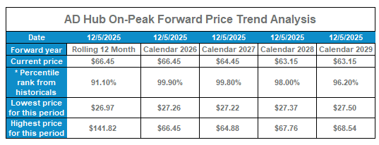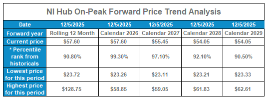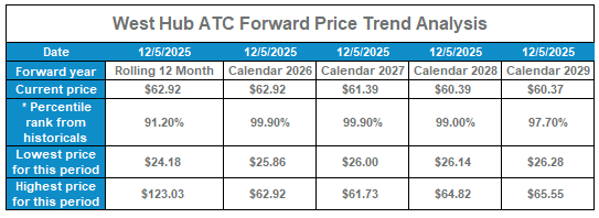 *Percentile rank from historicals represents the relation of current price and how it compares to historical pricing. For Calendar 2027, 99.8% indicates that the current price is lower than 0.2% of historical pricing dating back to July 2017.