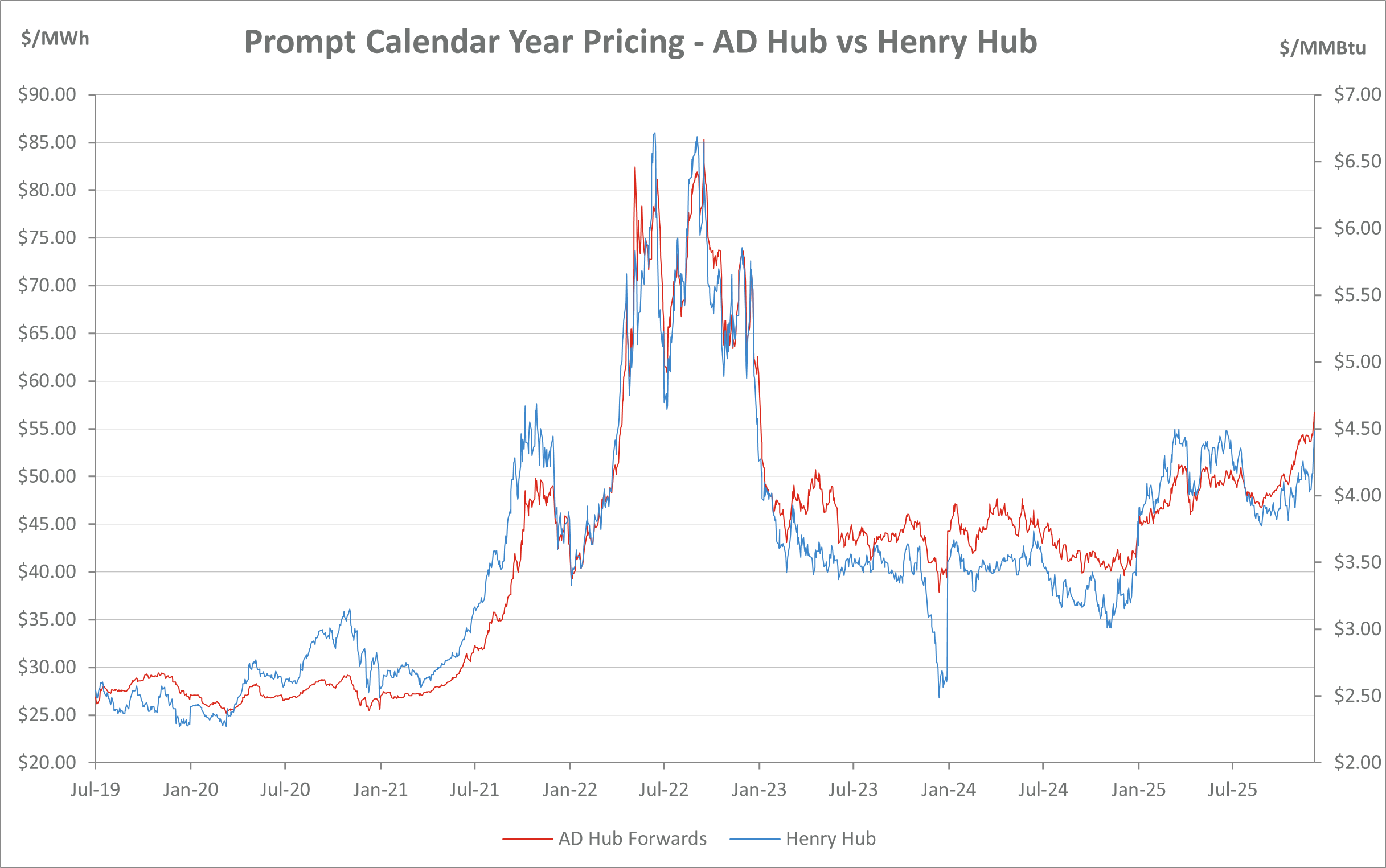 AD Hub Electricity vs. Henry Hub Natural Prices