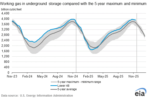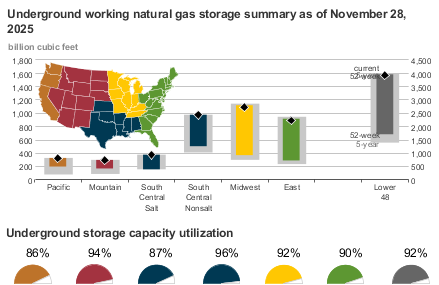 Working gas in storage was 3,923 Bcf as of Friday, November 28, 2025, according to EIA estimates. This represents a net decrease of 12 Bcf from the previous week. Stocks were 18 Bcf less than last year at this time and 191 Bcf above the five-year average of 3,732 Bcf. At 3,923 Bcf, total working gas is within the five-year historical range.