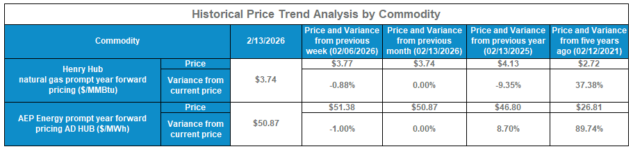 AEP Energy does not guarantee the accuracy, timeliness, suitability, completeness, freedom from error, or value of any information herein. The information presented is provided “as is”, “as available”, and for informational purposes only, speaks only to events or circumstances on or before the date it is presented, and should not be construed as advice, a recommendation, or a guarantee of future results. AEP Energy disclaims any and all liabilities and warranties related hereto, including any obligation to update or correct the information herein. Summaries and website links included herein (collectively, “Links”) are not under AEP Energy’s control and are provided for reference only and not for commercial purposes. AEP Energy does not endorse or approve of the Links or related information and does not provide any warranty of any kind or nature related thereto. Forward-looking statements contained herein are based on forecasted or outlook information (including assumptions and estimations) but any such statements may be influenced by innumerable factors that could cause actual outcomes and results to be materially different from those anticipated. As such, these statements are subject to risks, uncertainties, fluctuating market conditions, and other factors that may cause actual results to differ materially from expectations and should not be relied upon. Whether or how the customer utilizes any such information is entirely its responsibility (for which it assumes the entire risk).
