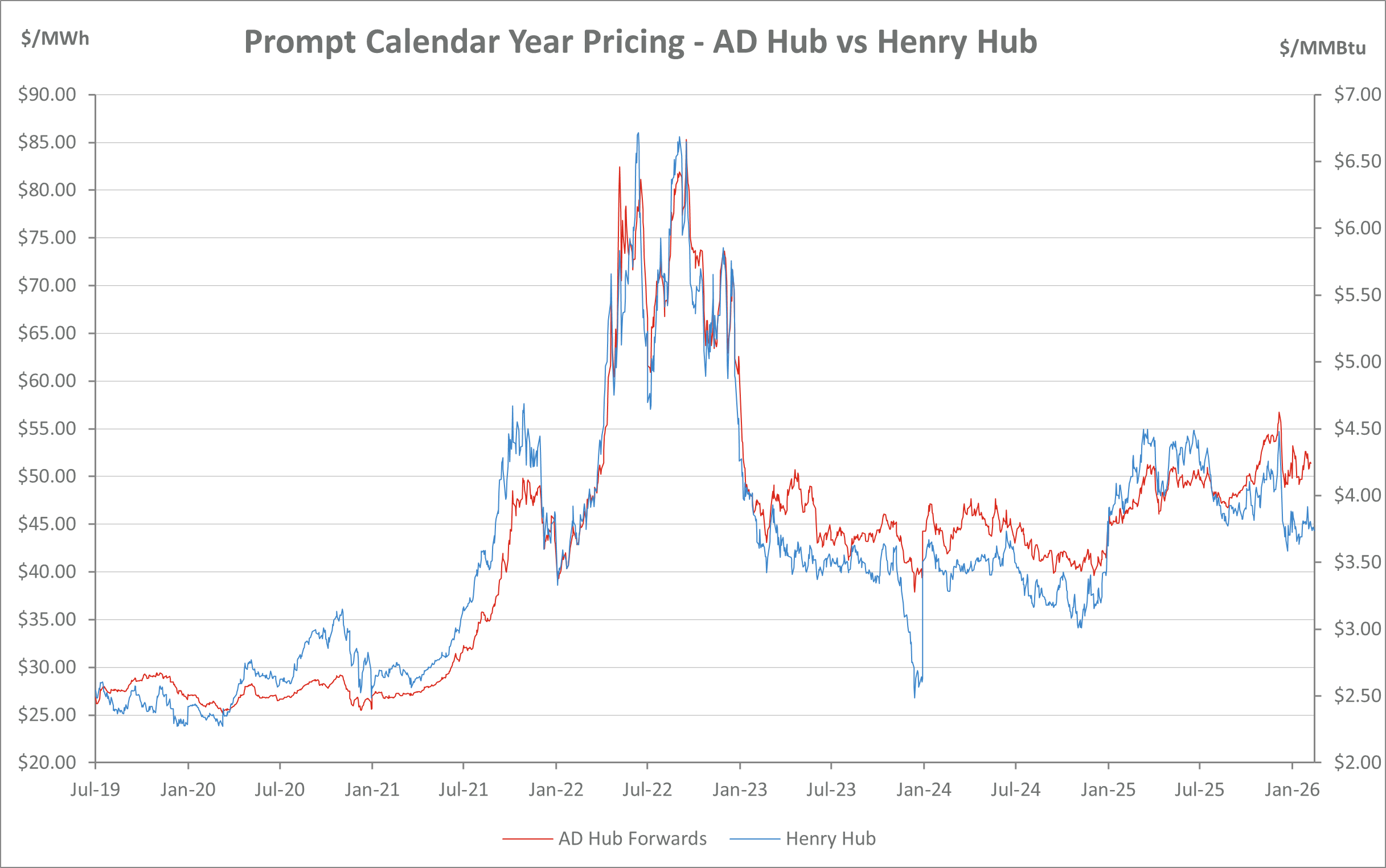 AD Hub Electricity vs. Henry Hub Natural Prices