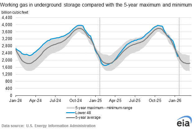 Working gas in storage was 2,214 Bcf as of Friday, February 6, 2026, according to EIA estimates. This represents a net decrease of 249 Bcf from the previous week. Stocks were 97 Bcf less than last year at this time and 130 Bcf below the five-year average of 2,344 Bcf. At 2,214 Bcf, total working gas is within the five-year historical range.