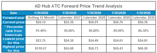 *Percentile rank from historicals represents the relation of current price and how it compares to historical pricing. For Calendar 2028, 96.2% indicates that the current price is lower than 3.8% of historical pricing dating back to July 2017.