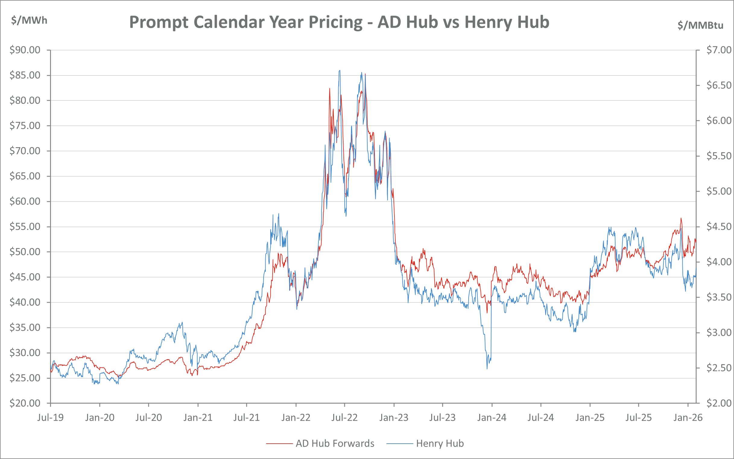 AD Hub Electricity vs. Henry Hub Natural Prices