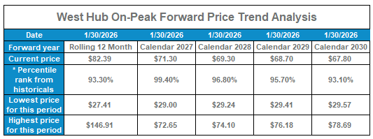 Friday, January 30 – Colder revisions to the February forecast moved power and natural gas prices higher at the end of the week. Natural gas posted a notable increase on the day, which supported gains in term power prices. In the cash market, overnight hours continued to show relative strength, keeping off-peak prices elevated.