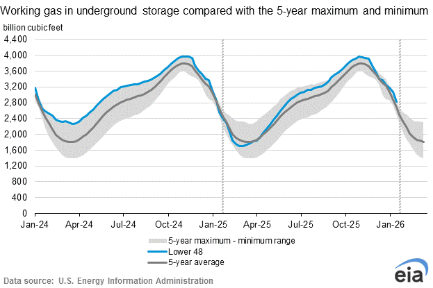 Working gas in storage was 2,823 Bcf as of Friday, January 23, 2026, according to EIA estimates. This represents a net decrease of 242 Bcf from the previous week. Stocks were 206 Bcf higher than last year at this time and 143 Bcf above the five-year average of 2,680 Bcf. At 2,823 Bcf, total working gas is within the five-year historical range.