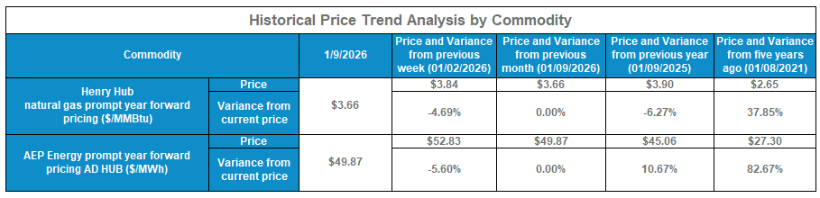 Friday January 9 – Warmer trends in the January forecast prompted a market sell-off heading into the weekend. Both natural gas and term power declined sharply today as weather projections remain mild to relatively warm.
