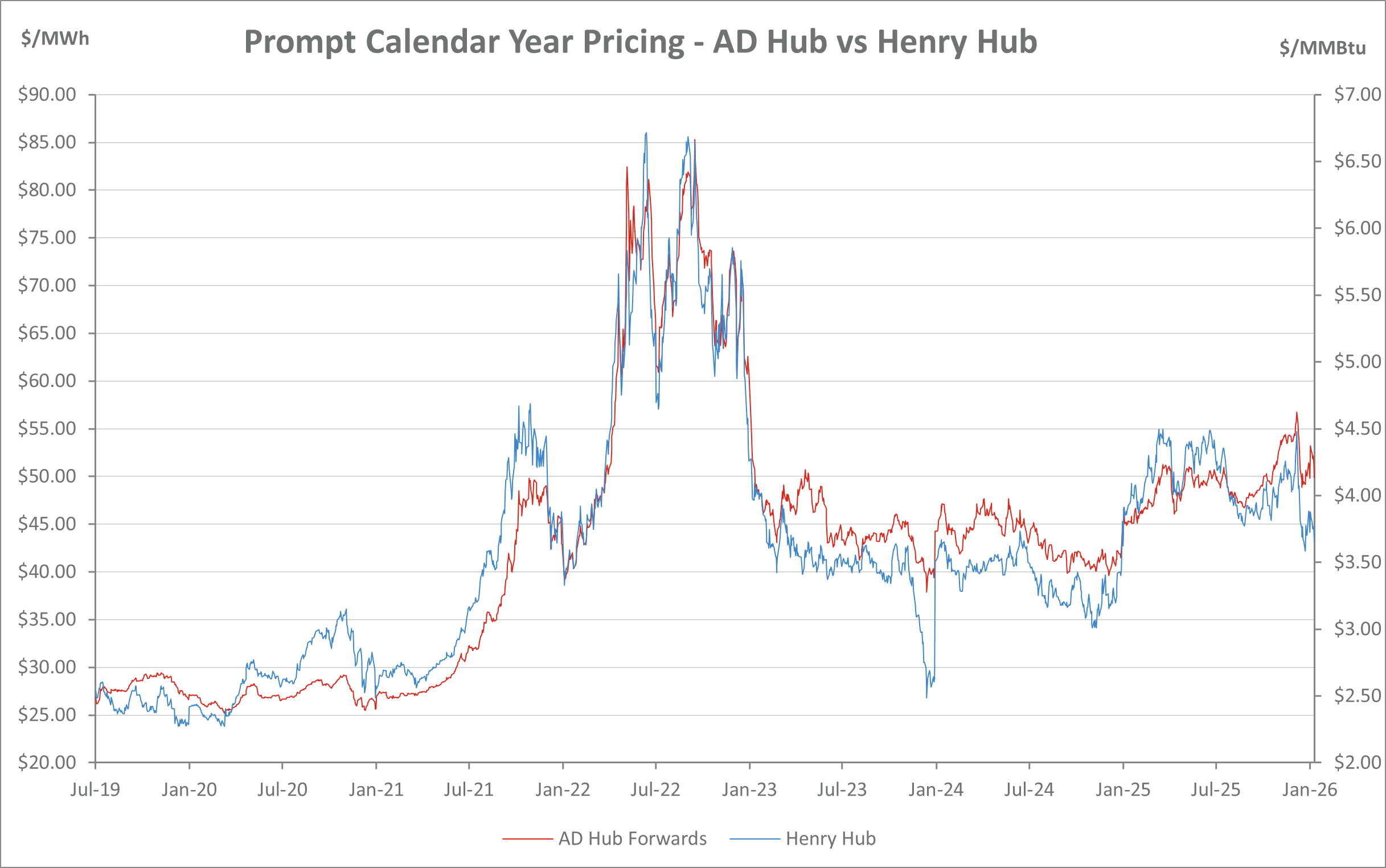 AD Hub Electricity vs. Henry Hub Natural Prices