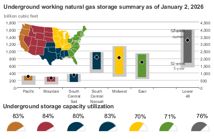Working gas in storage was 3,256 Bcf as of Friday, January 2, 2026, according to EIA estimates. This represents a net decrease of 119 Bcf from the previous week. Stocks were 123 Bcf less than last year at this time and 31 Bcf above the five-year average of 3,225 Bcf. At 3,256 Bcf, total working gas is within the five-year historical range.