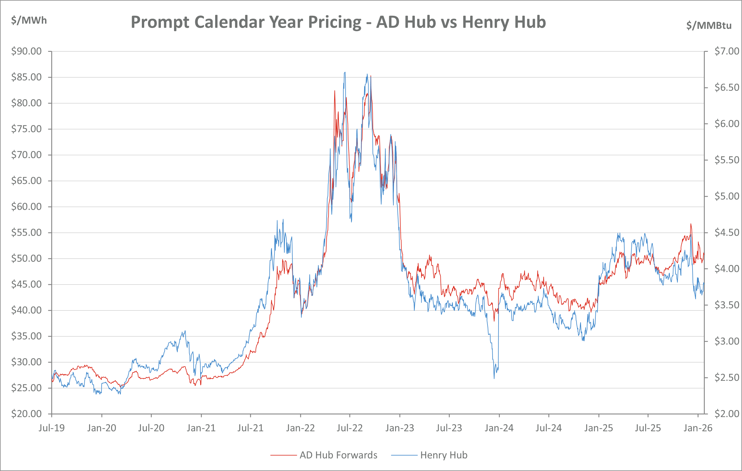 AD Hub Electricity vs. Henry Hub Natural Prices