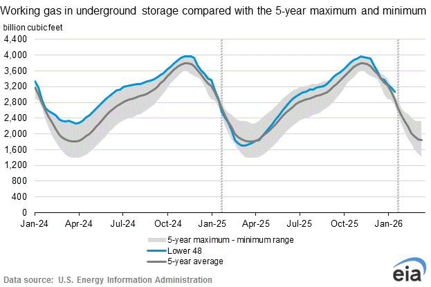 Working gas in storage was 3,065 Bcf as of Friday, January 16, 2026, according to EIA estimates. This represents a net decrease of 120 Bcf from the previous week. Stocks were 141 Bcf higher than last year at this time and 177 Bcf above the five-year average of 2,888 Bcf. At 3,065 Bcf, total working gas is above the five-year historical range.
