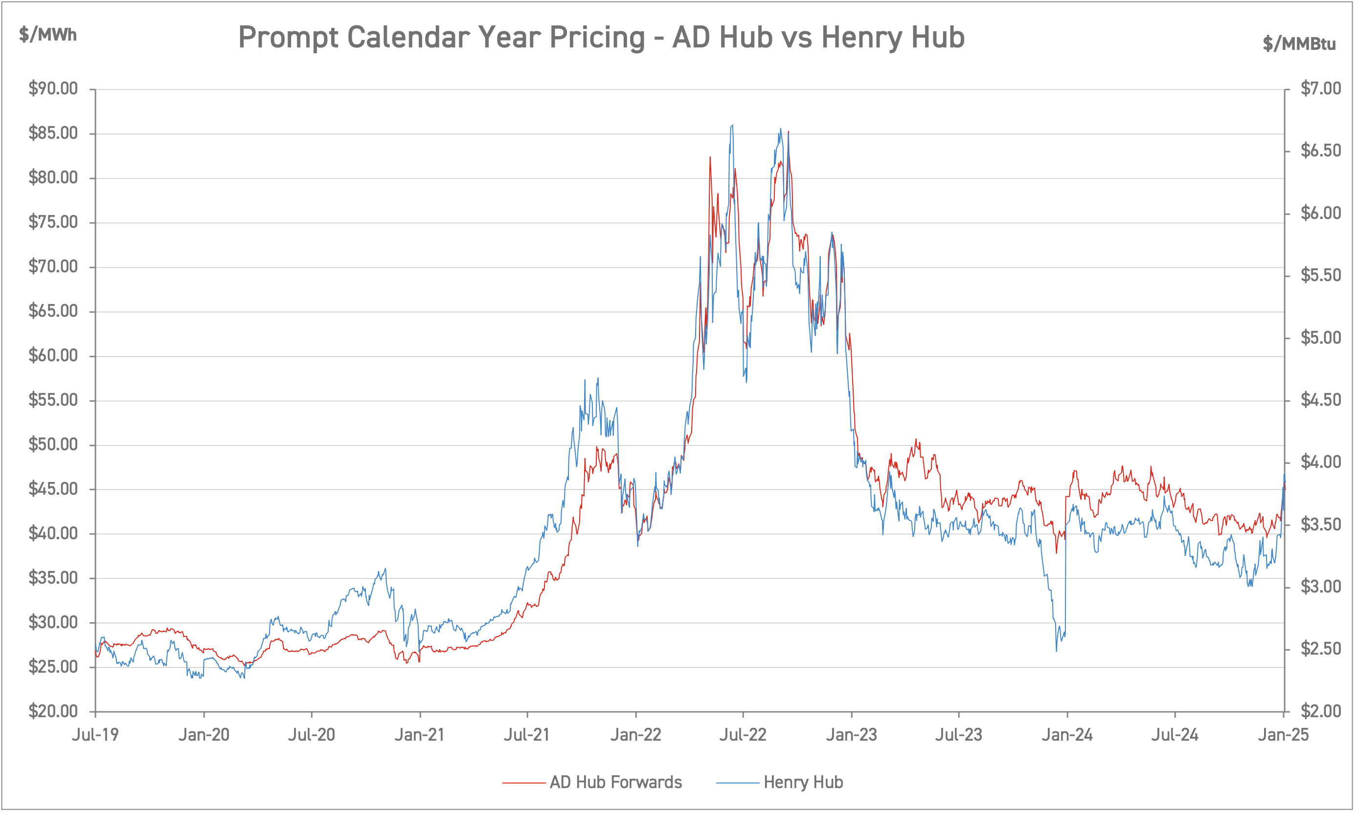 AD Hub Electricity vs. Henry Hub Natural Prices