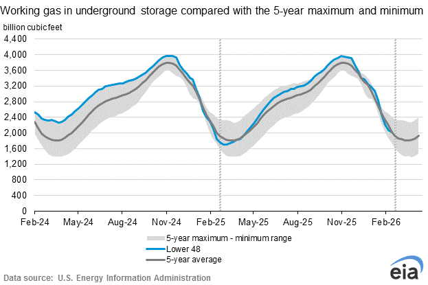 Working gas in storage was 2,018 Bcf as of Friday, February 20, 2026, according to EIA estimates. This represents a net decrease of 52 Bcf from the previous week. Stocks were 141 Bcf higher than last year at this time and 7 Bcf below the five-year average of 2,025 Bcf. At 2,018 Bcf, total working gas is within the five-year historical range.