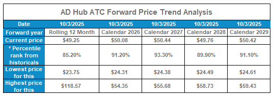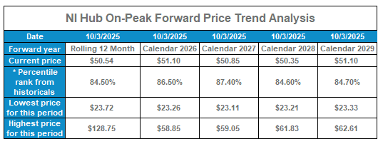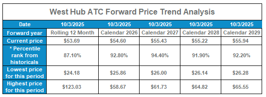 *Percentile rank from historicals represents the relation of current price and how it compares to historical pricing. For Calendar 2027, 96.3% indicates that the current price is lower than 3.7% of historical pricing dating back to July 2017.