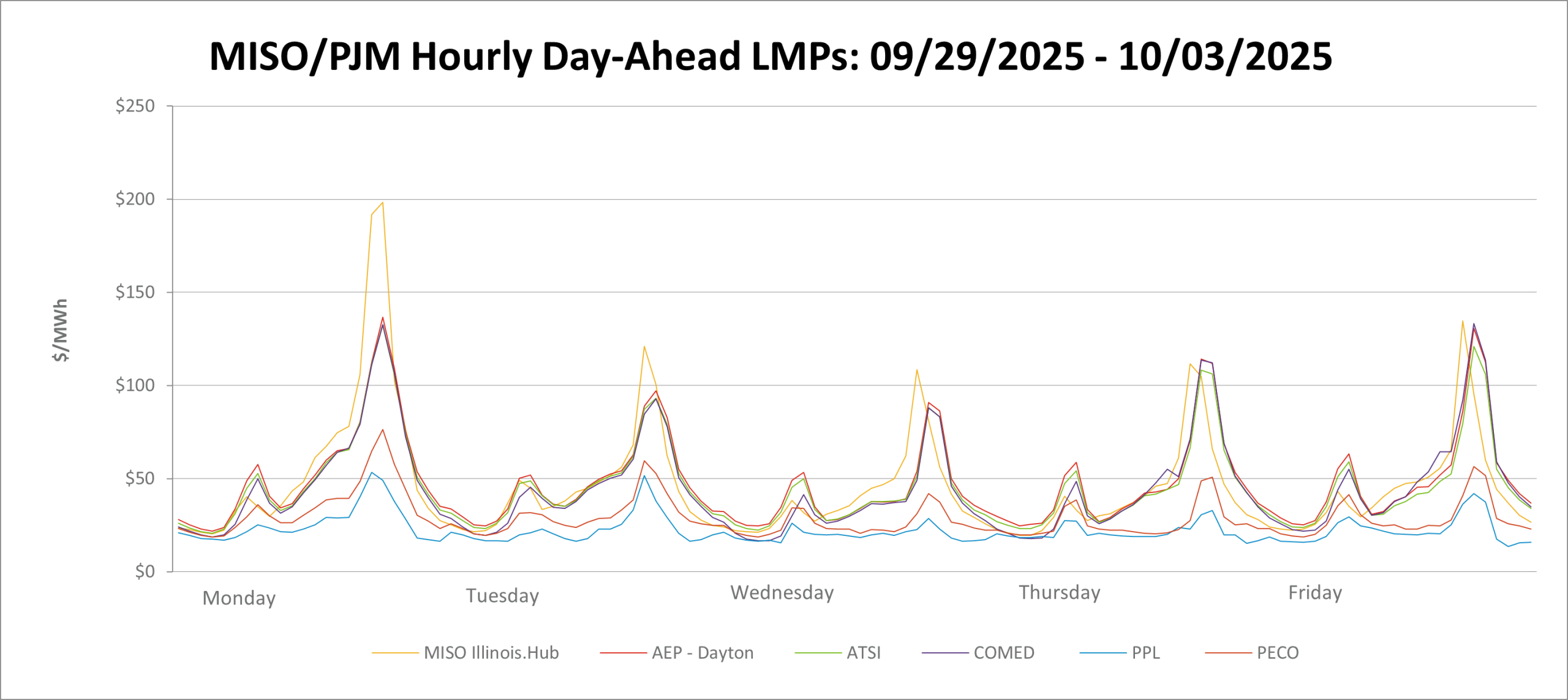 Friday October 3 – Near-term power prices remained supported this week, with elevated temperatures persisting in the forecast despite a decline in natural gas prices heading into the weekend. Activity in the evening peak hours, including relatively strong liquidations, has contributed to maintaining strength in the near-term power market.