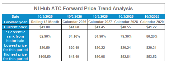 *Percentile rank from historicals represents the relation of current price and how it compares to historical pricing. For Calendar 2027, 93.3% indicates that the current price is lower than 6.7% of historical pricing dating back to July 2017.