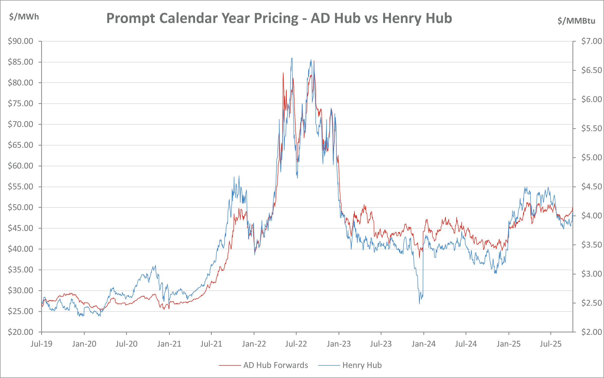 AD Hub Electricity vs. Henry Hub Natural Prices
