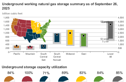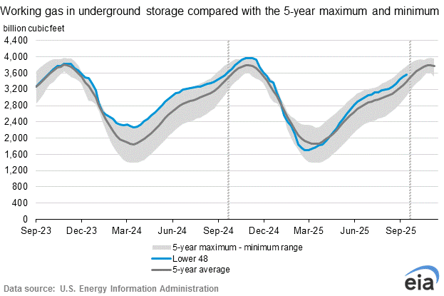Working gas in storage was 3,561 Bcf as of Friday, September 26, 2025, according to EIA estimates. This represents a net increase of 53 Bcf from the previous week. Stocks were 21 Bcf higher than last year at this time and 171 Bcf above the five-year average of 3,390 Bcf. At 3,561 Bcf, total working gas is within the five-year historical range.