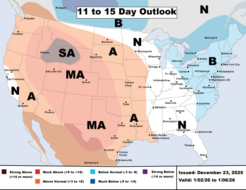 Monday December 22 – Weekend weather models added a bit of demand, but overall, they continue to show a generally warm pattern through the 11-15-day period. Temperatures in Texas remain unseasonably warm for much of the next two weeks, and as a result, power prices are moving lower today.