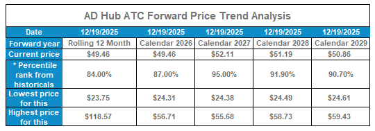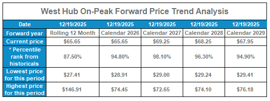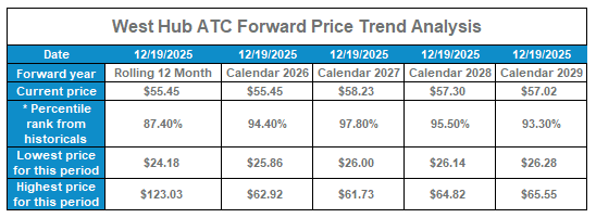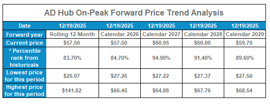 *Percentile rank from historicals represents the relation of current price and how it compares to historical pricing. For Calendar 2027, 97.8% indicates that the current price is lower than 2.2% of historical pricing dating back to July 2017.Â
