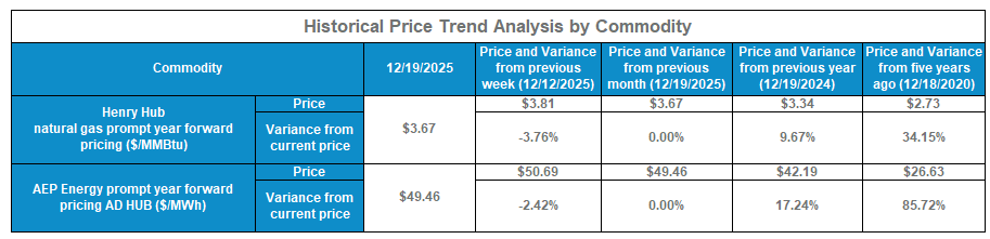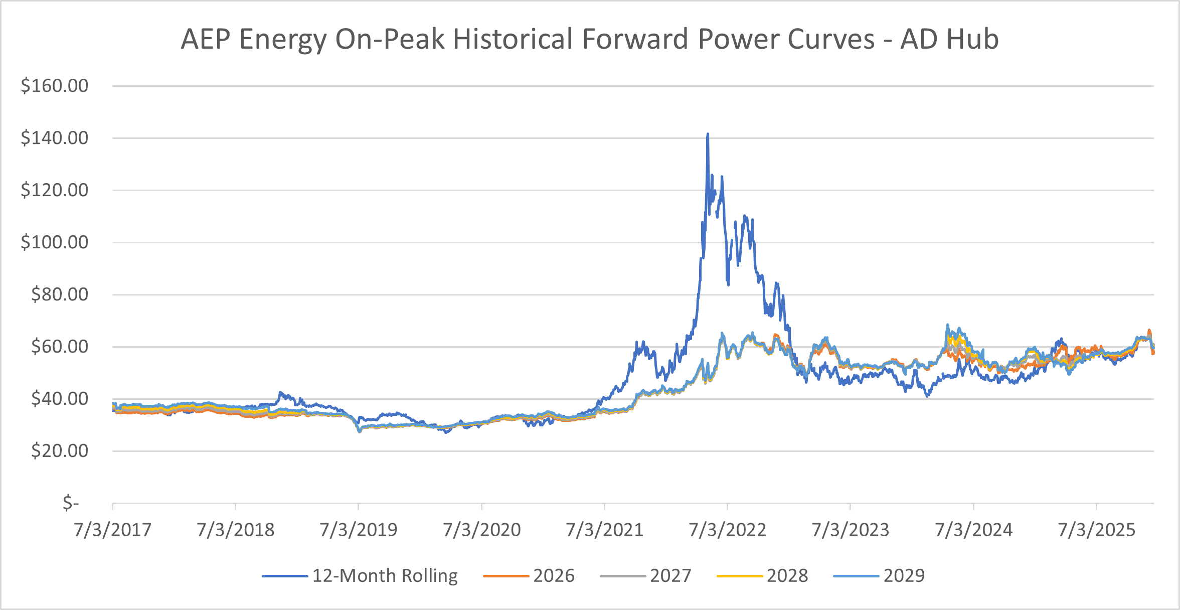 AEP Energy does not guarantee the accuracy, timeliness, suitability, completeness, freedom from error, or value of any information herein. The information presented is provided “as is”, “as available”, and for informational purposes only, speaks only to events or circumstances on or before the date it is presented, and should not be construed as advice, a recommendation, or a guarantee of future results. AEP Energy disclaims any and all liabilities and warranties related hereto, including any obligation to update or correct the information herein. Summaries and website links included herein (collectively, “Links”) are not under AEP Energy’s control and are provided for reference only and not for commercial purposes. AEP Energy does not endorse or approve of the Links or related information and does not provide any warranty of any kind or nature related thereto. Forward-looking statements contained herein are based on forecasted or outlook information (including assumptions and estimations) but any such statements may be influenced by innumerable factors that could cause actual outcomes and results to be materially different from those anticipated. As such, these statements are subject to risks, uncertainties, fluctuating market conditions, and other factors that may cause actual results to differ materially from expectations and should not be relied upon. Whether or how the customer utilizes any such information is entirely its responsibility (for which it assumes the entire risk).
