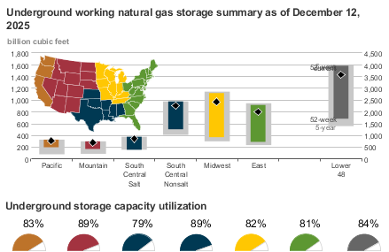 Working gas in storage was 3,579 Bcf as of Friday, December 12, 2025, according to EIA estimates. This represents a net decrease of 167 Bcf from the previous week. Stocks were 61 Bcf less than last year at this time and 32 Bcf above the five-year average of 3,547 Bcf. At 3,579 Bcf, total working gas is within the five-year historical range.