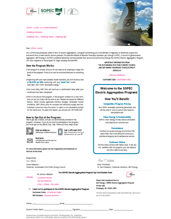 Under the SOPEC Electric Aggregation Program, SOPEC acts on behalf of its electricity consumers to select an electricity supply provider who, through the power of volume buying, is able to secure electricity at competitive prices. The PUCO has taken steps to ensure that Ohio’s competitive electricity environment is consumer-friendly. Voters in each of the SOPEC member communities approved this aggregation program and each SOPEC member community (including Blendon Township) also passed an ordinance adopting SOPEC’s Electric Aggregation Program. SOPEC has selected AEP Energy as its preferred electricity supply provider to serve the residents and small businesses of SOPEC’s member communities including Blendon Township.