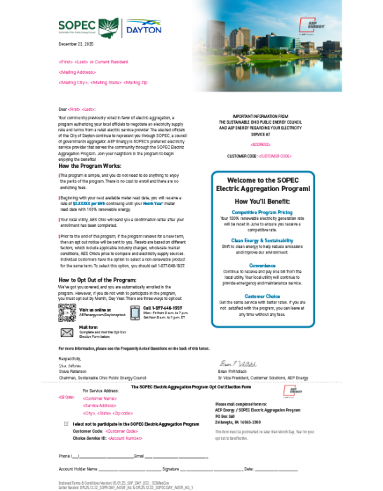 Under the SOPEC Electric Aggregation Program, SOPEC acts on behalf of its electricity consumers to select an electricity supply provider who, through the power of volume buying, is able to secure electricity at competitive prices. The PUCO has taken steps to ensure that Ohio’s competitive electricity environment is consumer-friendly. Voters in each of the SOPEC member communities approved this aggregation program and each SOPEC member community (including the City of Dayton) also passed an ordinance adopting SOPEC’s Electric Aggregation program. SOPEC has selected AEP Energy as its preferred electricity supply provider to serve the residents and small businesses of SOPEC’s member communities including the City of Dayton.