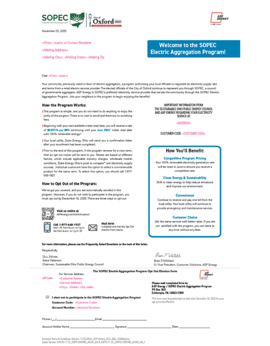 Under the SOPEC Electric Aggregation Program, SOPEC acts on behalf of its electricity consumers to select an electricity supply provider who, through the power of volume buying, is able to secure electricity at competitive prices. The PUCO has taken steps to ensure that Ohio’s competitive electricity environment is consumer-friendly. Voters in each of the SOPEC member communities approved this aggregation program and each SOPEC member community (including the City of Oxford) also passed an ordinance adopting SOPEC’s Electric Aggregation program. SOPEC has selected AEP Energy as its preferred electricity supply provider to serve the residents and small businesses of SOPEC’s member communities including the City of Oxford.