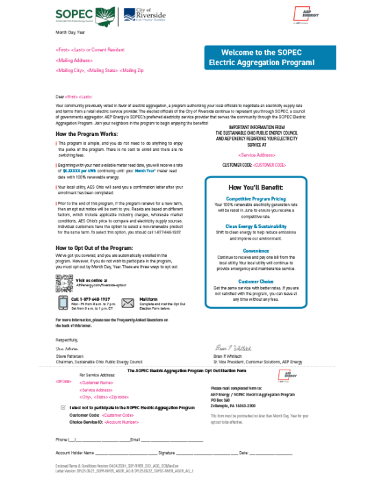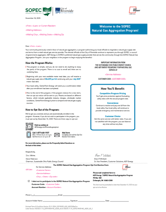 Under the SOPEC Natural Gas Aggregation Program, SOPEC acts on behalf of its natural gas consumers to select an natural gas supply provider who, through the power of volume buying, is able to secure natural gas at competitive prices. The PUCO has taken steps to ensure that Ohio’s competitive natural gas environment is consumer-friendly. Voters in each of the SOPEC member communities approved this aggregation program and each SOPEC member community (including the City of Riverside) also passed an ordinance adopting SOPEC’s Natural Gas Aggregation program. SOPEC has selected AEP Energy as its preferred natural gas supply provider to serve the residents and small businesses of SOPEC’s member communities including the City of Riverside.
