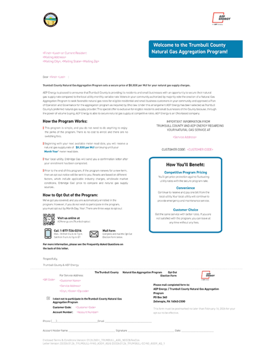 Recently, you received an opt out letter for Trumbull County’s Natural Gas Aggregation Program. As you are with your local utility for your natural gas supply, the rate you pay can fluctuate due to market conditions. Get stability for your bills with a program rate of $4.919 per Mcf.